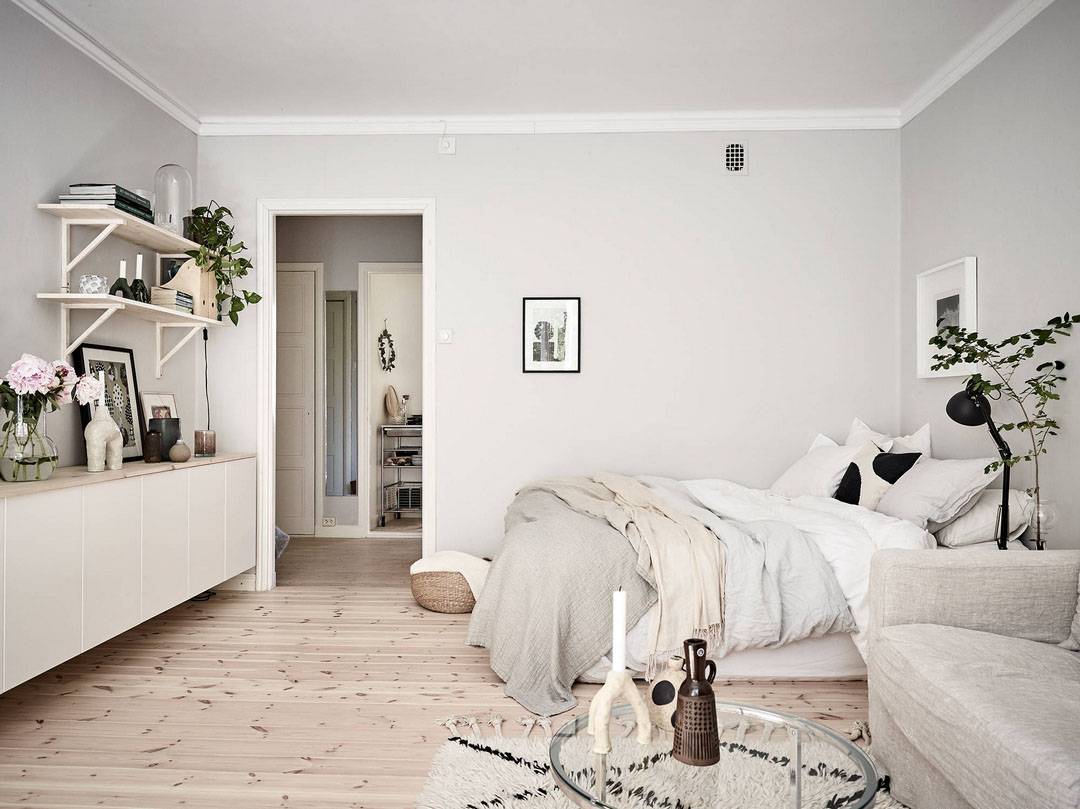 Оптимальное решение для интерьера квартиры 38 кв. метров – скандинавский стиль: нейтральные по цвету стены и потолок, деревянный декор и минимум мебели.