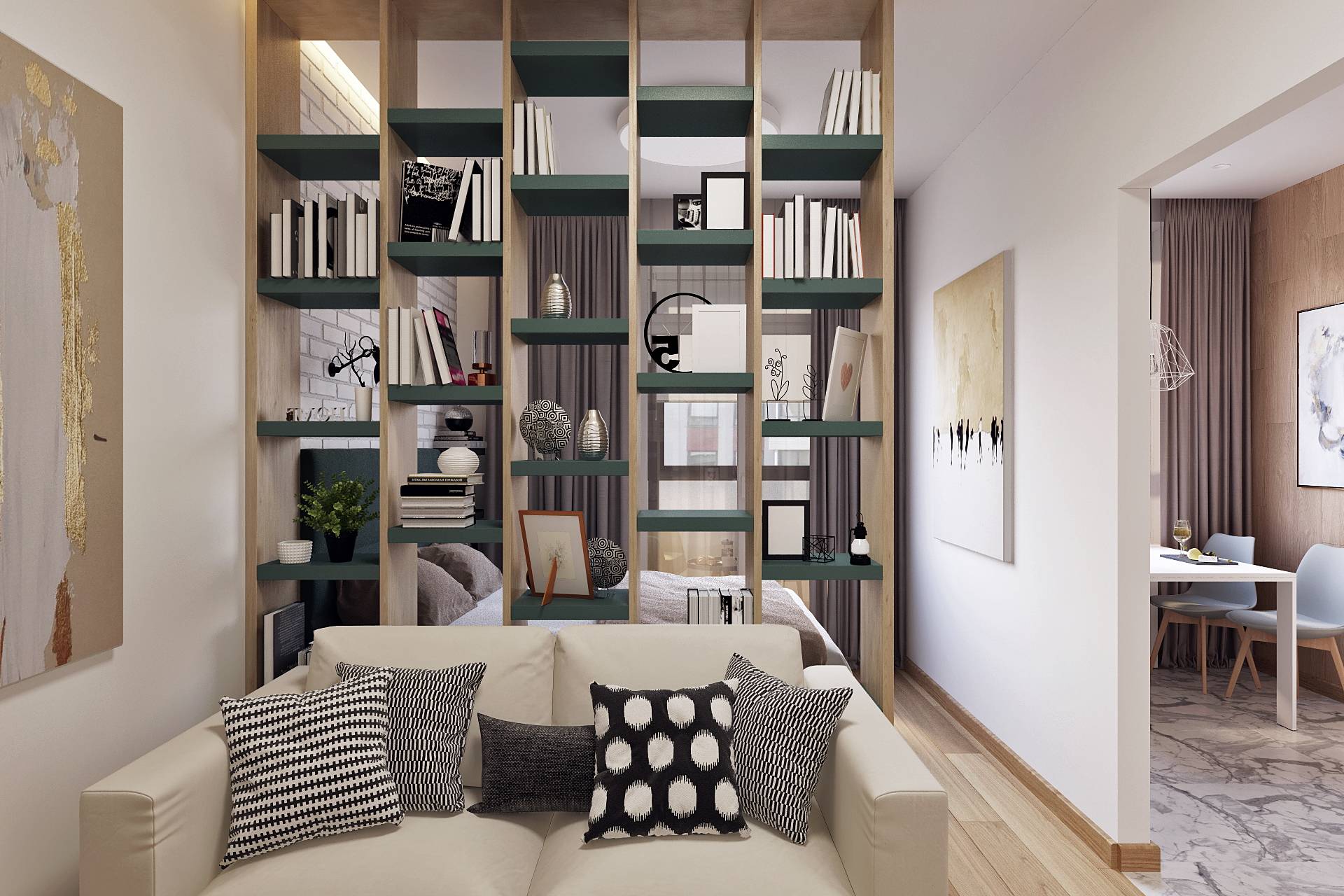 Малогабаритную студию лучше разделять на функциональные зоны, используя разную отделку или правильную расстановку мебели, а не перегородки.