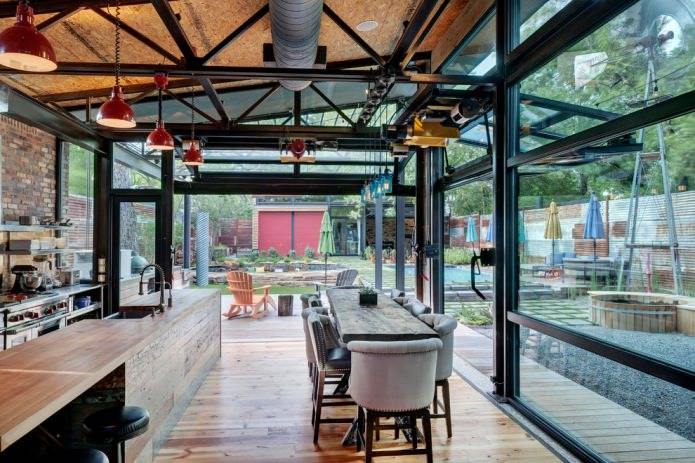 Загородный дом – идеальное место для использования стиля лофт. В отличие от городских квартир, дом может иметь большие окна во всю стену, что характерно для направления лофт и бесспорно является плюсом.