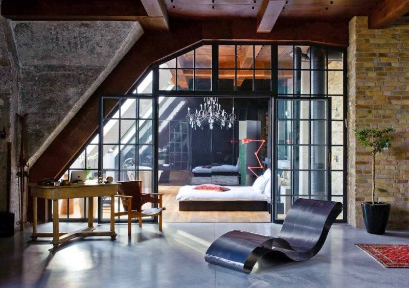 Оформление жилых помещений в этом направлении предусматривает создание своеобразной атмосферы, присущей бывшим промышленным объектам, переоборудованным под жилье. Этому способствует наличие «фабричной» фактуры в отделке и предметов промышленного антуража: