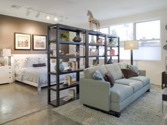 - В помещении минимум мебели, выполняющей исключительно практическую функцию: кровать или диван, кресла, стеллажи с книгами и открытые полки.