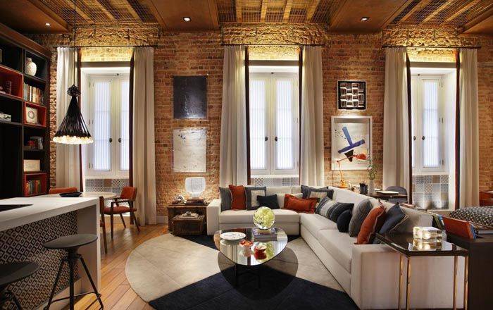Уютная гостиная в стиле лофт в городской квартире Нью-Йорка.