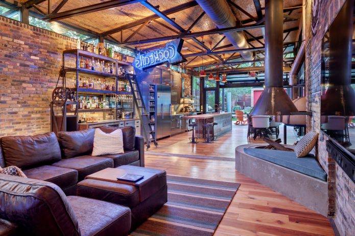Данный стиль предполагает акцентирование внимания на неотделанной кирпичной кладке, на подчеркнуто открытых трубах и других коммуникациях, а также на грубости серой штукатурки. Как правило, в стиле лофт оформляют помещения квартир-студий или просторные комнаты. В стилистике не используется разделение на функциональные зоны и комнаты, особенно ярко выраженное.