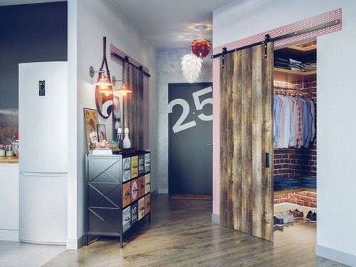 Раздвижная «а-ля» амбарная дверь подойдет для небольшой квартиры, так как не займет много мест в отличие от распашной. Для пола удачным выбором будет паркет или ламинат под состаренное дерево.