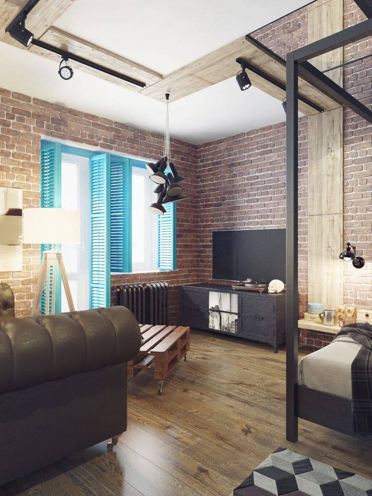 На фото дизайн маленькой студии в стиле лофт, совмещенной с балконом.