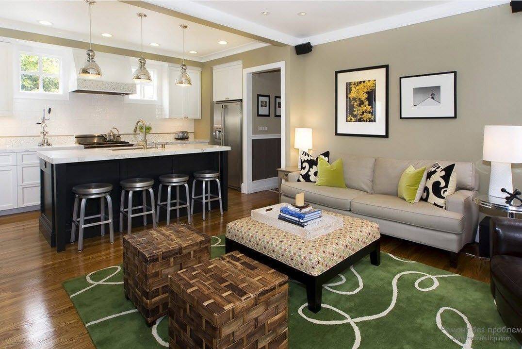 - Перегородка между помещением кухни и гостиной отсутствует, есть только одна большая комната.