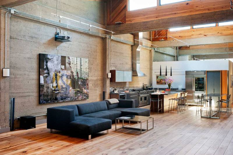Название loft в переводе с английского языка звучит как «чердак» или «комната сверху». Основополагающие детали квартиры в стиле лофт — довольно простая, но функциональная мебель, огромные окна без занавесок. Декор практически отсутствует, все цветовые решения имеют преимущественно холодные оттенки. А те элементы, которые в прочих стилях воспринимаются как недостаток — штукатурка на стенах, кирпичная кладь или пол из досок — в стиле loft считаются его изюминкой.