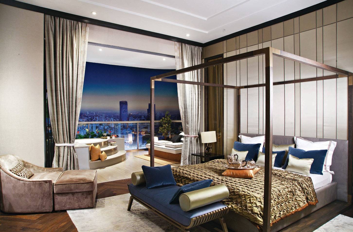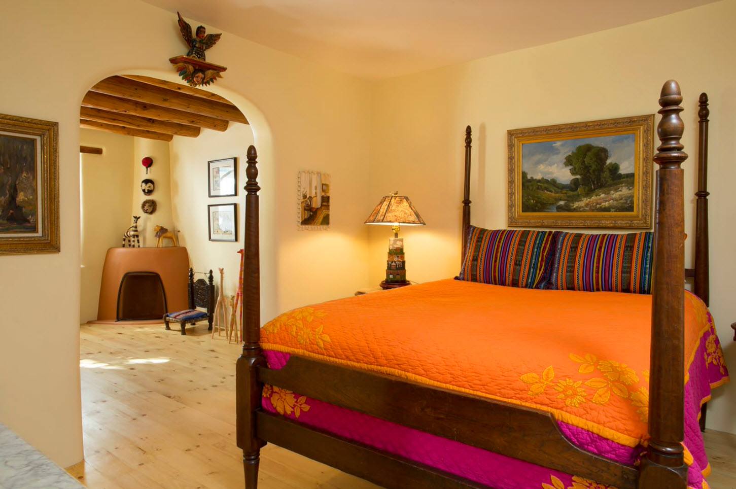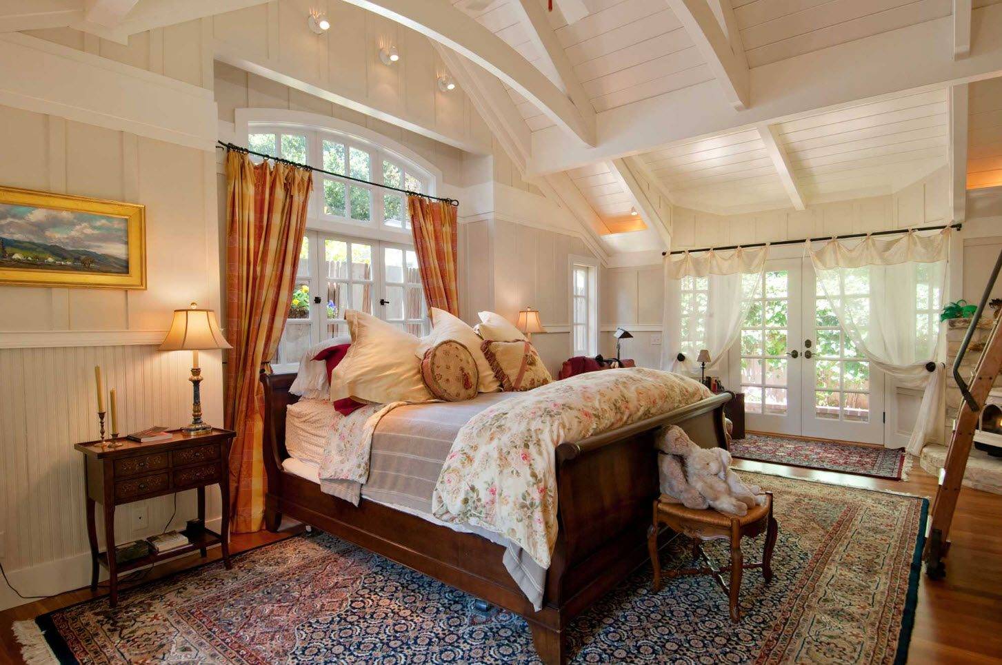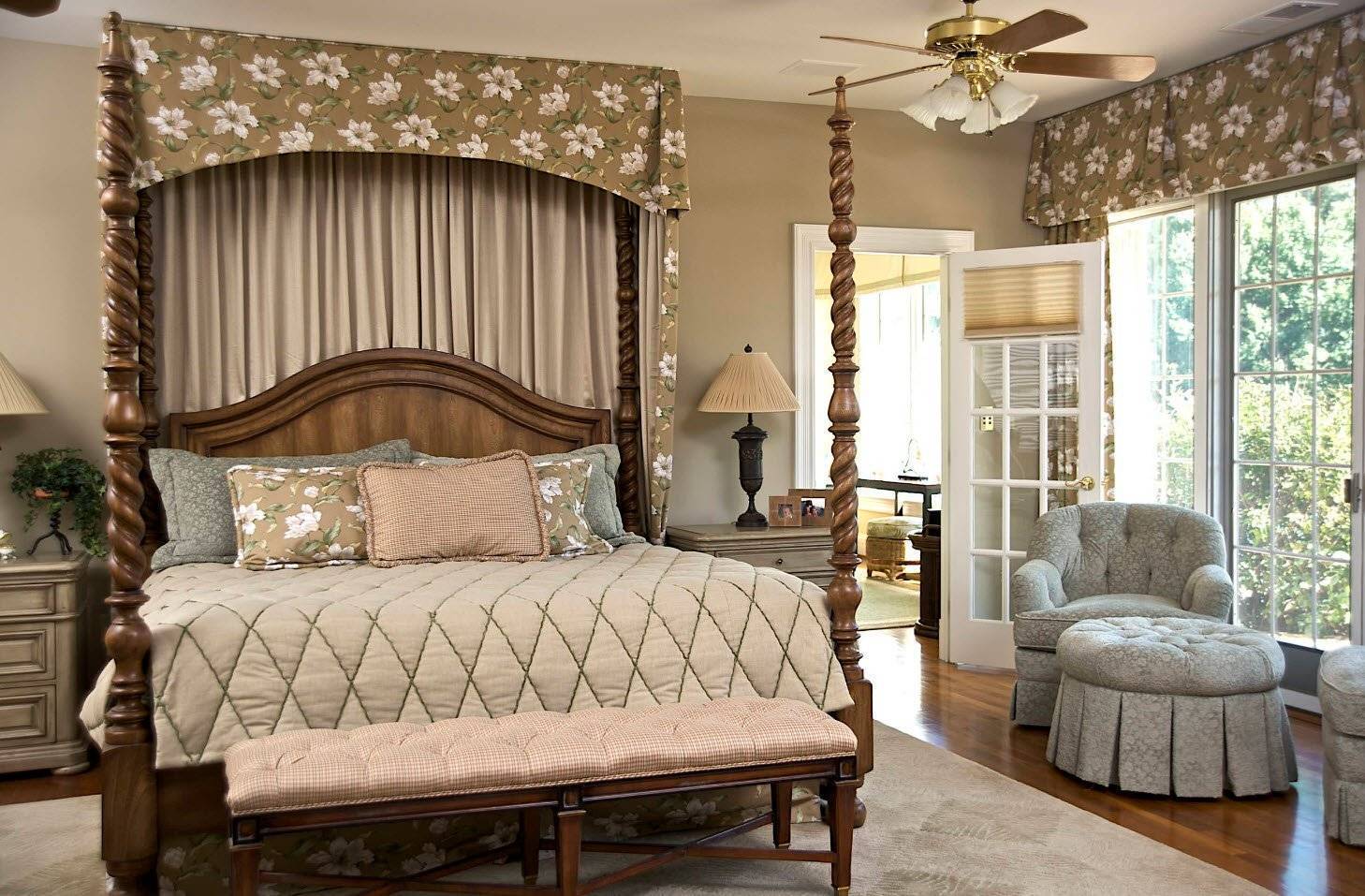 Здесь уместно преобладание натуральных и природных материалов. Кровати часто украшают с помощью живописной резьбы, позолоты, оснащают изогнутыми ножками, стилизованными спинками с обшивкой или балдахинами.