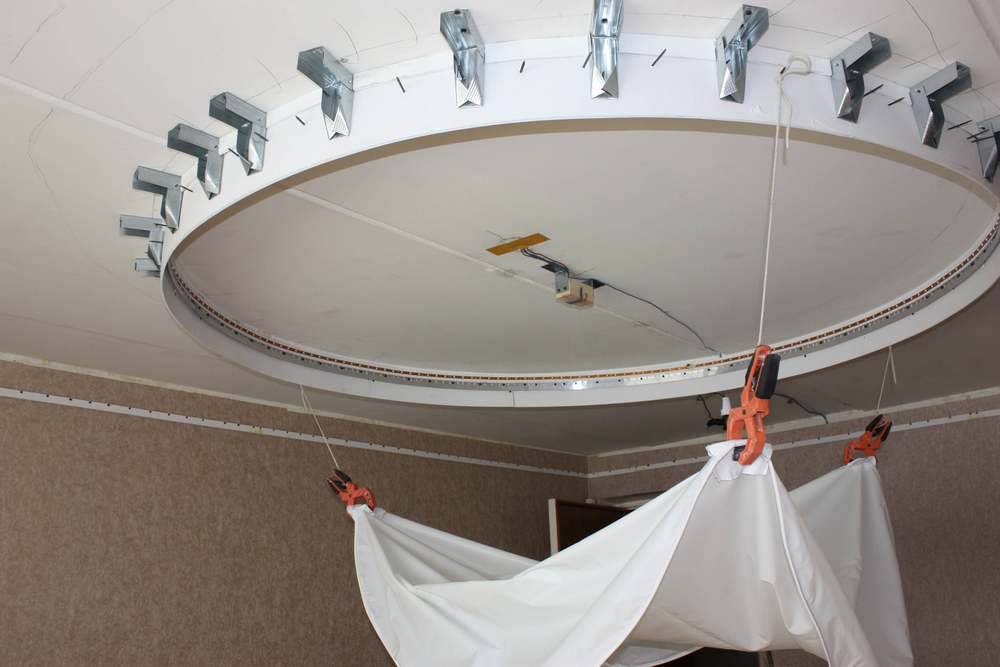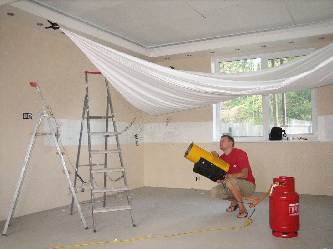 Перед тем, как натягивать полотно, его прогревают и заводят в пазы профиля для закрепления.