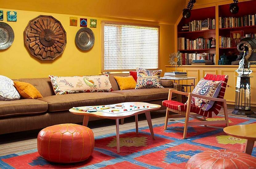 - Наблюдается комбинирование трех-четырех оттенков. Здесь не действуют правила сочетания и симметрии. Яркие тона не используются в точных пропорциях, они просматриваются в подушках, покрывалах, накидках.