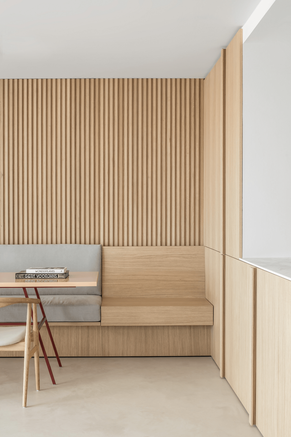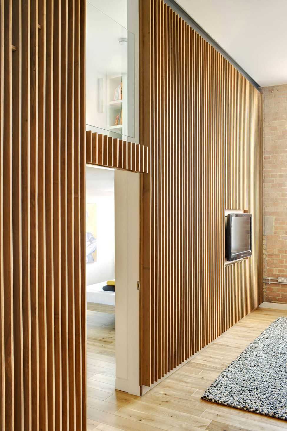 Обычно это самое большое помещение, которое выполняет несколько функций, поэтому рейки здесь подойдут для зонирования пространства. С помощью перегородки можно отделить обеденную зону, если гостиная служит еще и столовой, либо место для работы.
