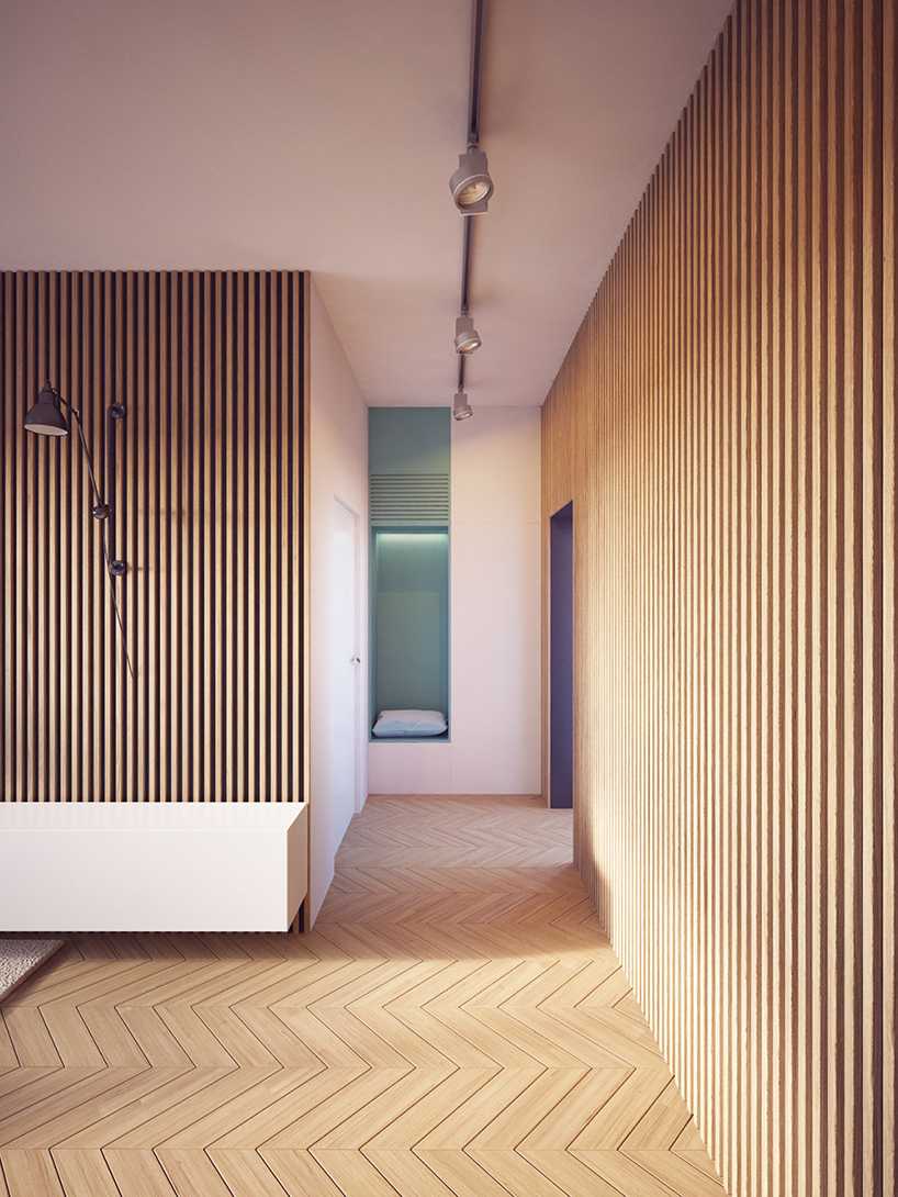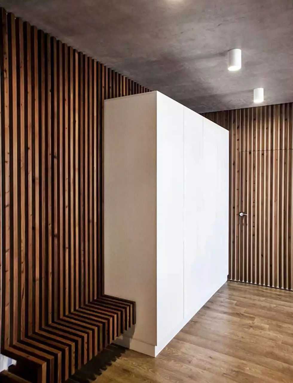 Нередко это маленькое помещение вызывает немало вопросов. Большинство квартир имеют небольшой или узкий коридор, который сложно оформлять. Рейки могут с этим помочь – расположите их так, чтобы визуально уравновесить пространство. В длинном и узком коридоре – горизонтально, вокруг двери и на стене напротив. Если в помещении низкий потолок, то ситуацию немного улучшит вертикальное размещение декора.