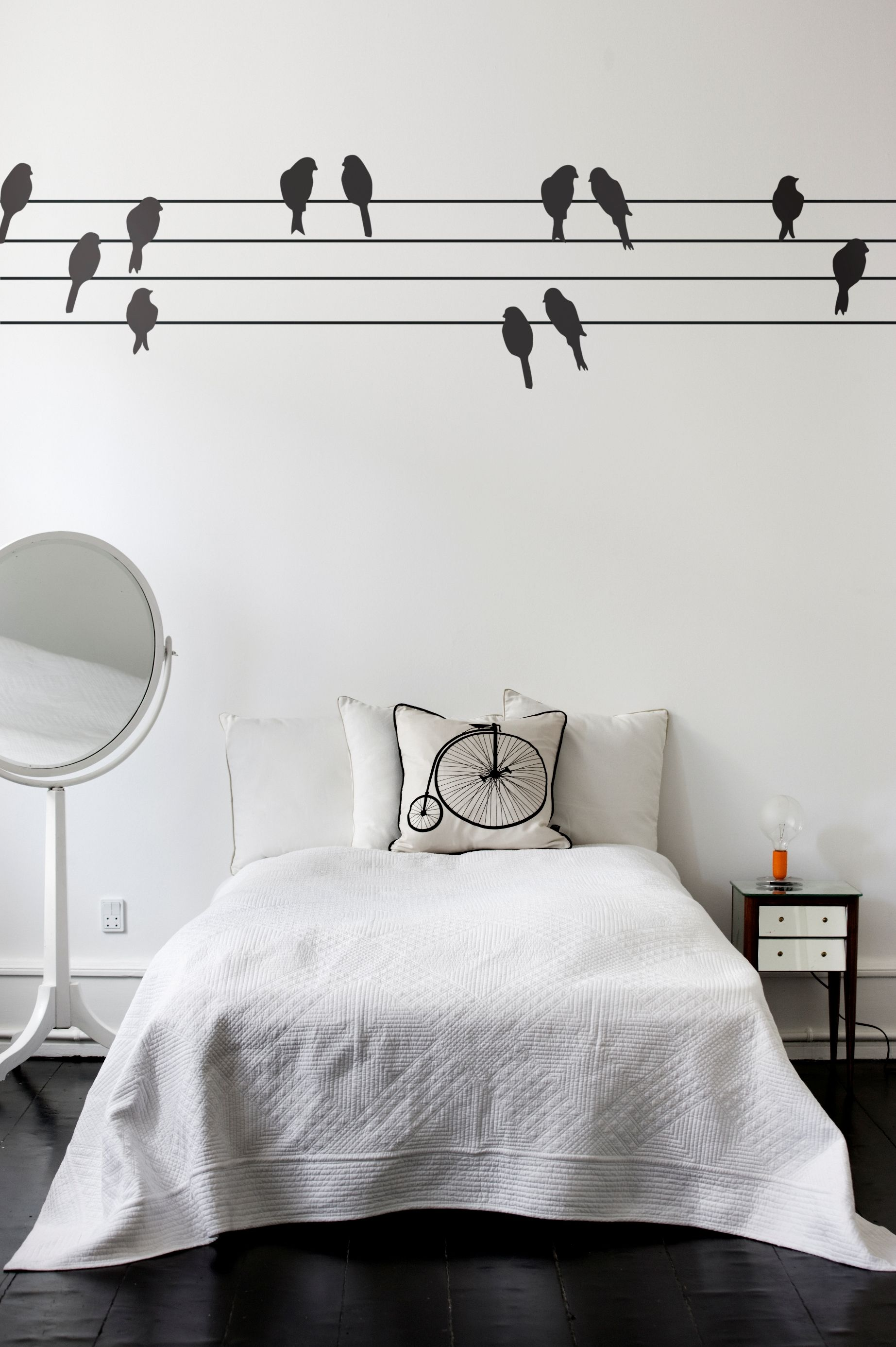 - С помощью правильно выбранного рисунка можно зрительно изменить площадь или конфигурацию комнаты, преобразить декор стен. Вертикальные изображения (например, стволы деревьев, Эйфелева башня) дают возможность визуально приподнять потолок, растягивая поверхность в высоту. Горизонтальные линии рисунка расширяют стены. Примеры таких наклеек, «работающих» с боковыми площадями, изображены на фото.