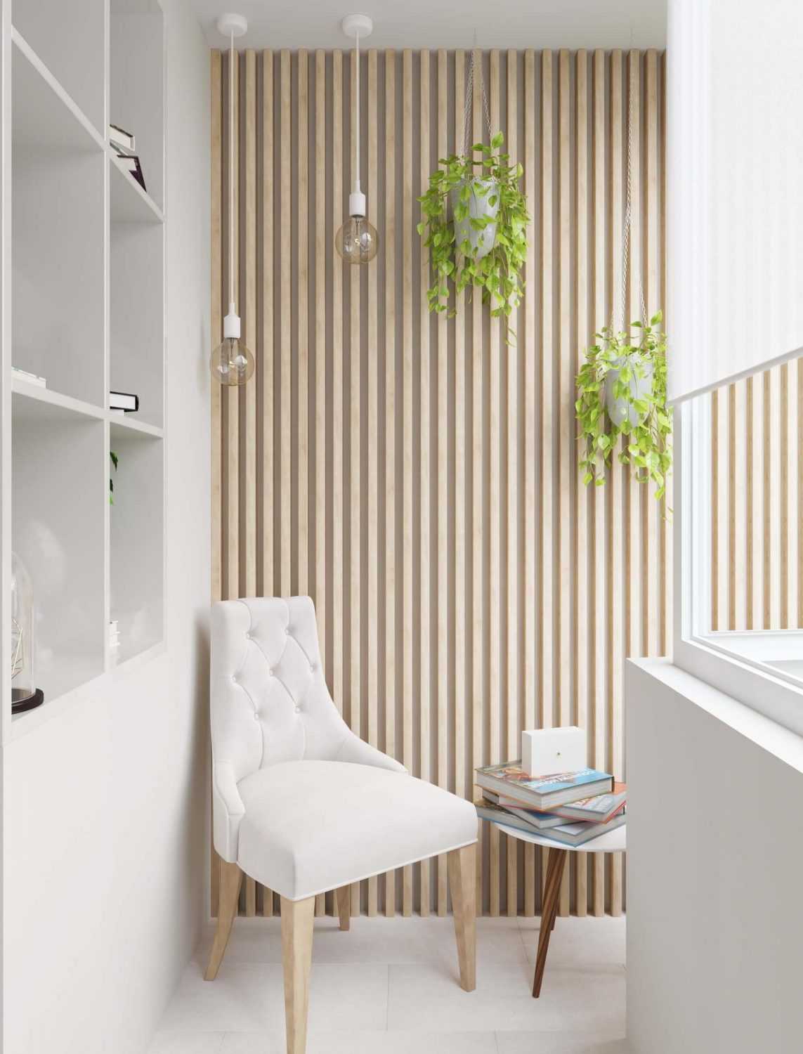 Недорогой, но стильный вариант отделки будет хорошо смотреться. Рейки лучше размещать горизонтально на стене. Можно повесить на них цветочные горшки и создать на балконе небольшой садик. Также с помощью решетки можно отделить зону для хранения, сделав полки с дверцами из реек.