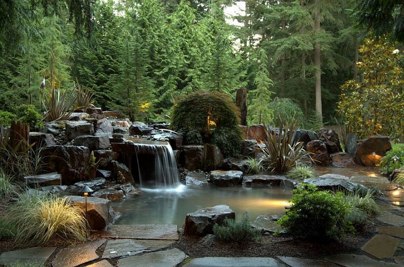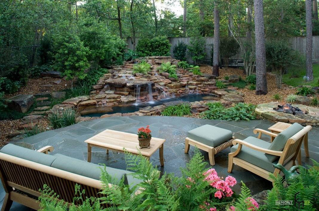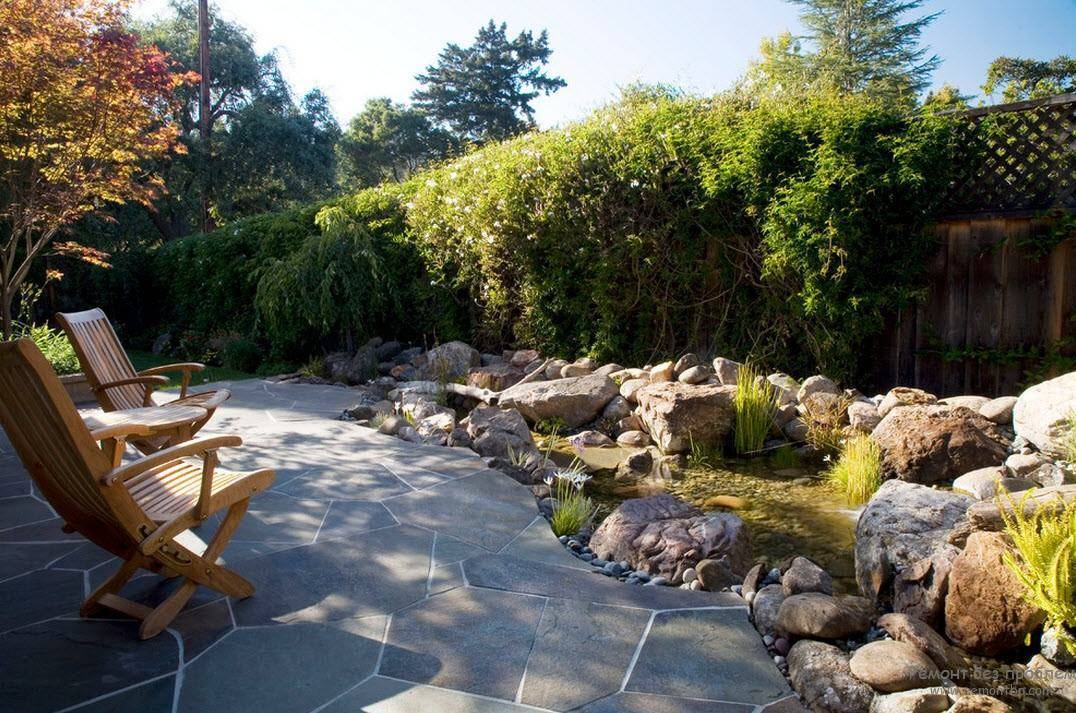 Одна сторона площадки должна обрамляться высокой стеной из камня в форме полуовала с нисходящими ступенями, расположенной ближе к середине площадки, где она окончательно сравняется с уровнем земли. В центральной части этой стенки должен устраиваться каскадный водопад: вода внизу будет падать в небольшую чашу, а далее ручьем поступать в водоем. Это центральная часть ансамбля. По обе стороны от ручья и водоема на площадке, вымощеной плиткой, можно обустроить зону отдыха с лежаками для принятия солнечных ванн или столиком и скамейками для отдыха, детскую площадку или сад с экзотическими растениями в кадках.