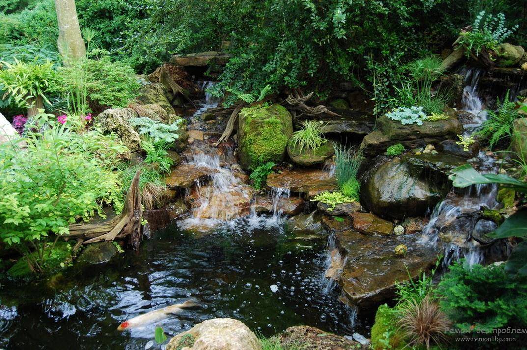 Использование насоса циркуляции и очистки воды позволяет организовать ручейки, водопады, замысловатые вливания-переливания. Водоем оживает, журчит, играет на солнце.