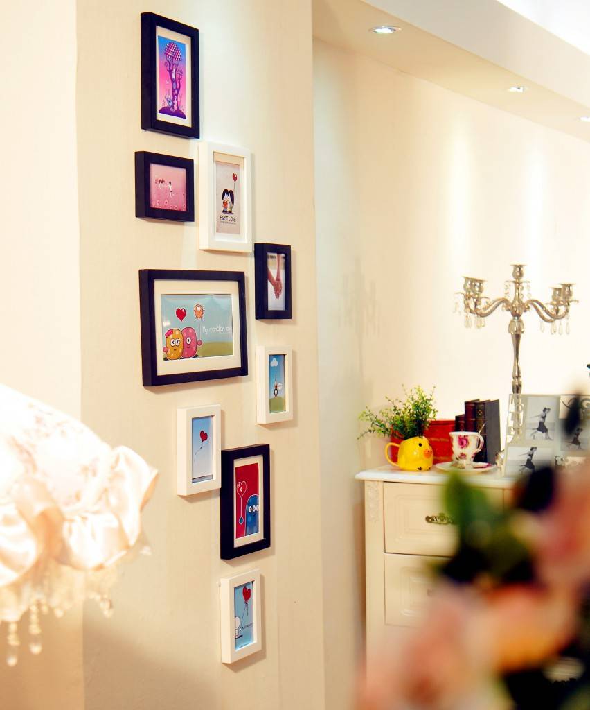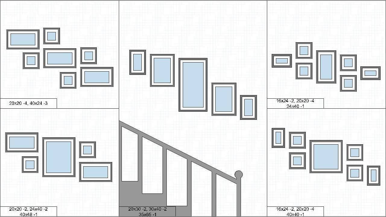 1. При формировании ансамбля из разных по величине рамок самую большую из них (или ряд аналогичных по размерам решений) необходимо расположить на уровне глаз. Композиции из 3-5 снимков можно развесить по методу галереи – от большей к меньшей, – но также на уровне глаз.