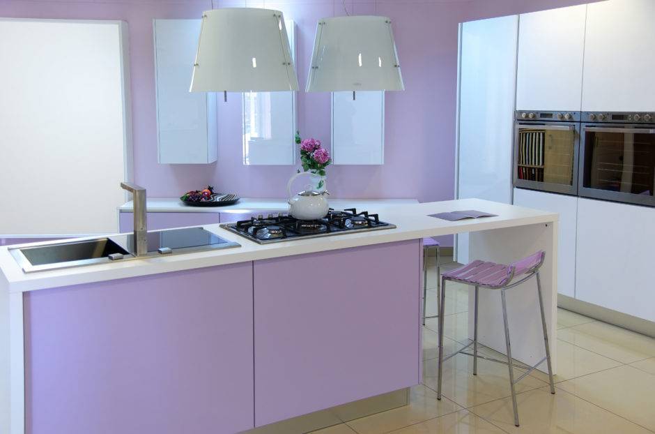 скромный сиреневый на удивление агрессивен. Проекты кухни лавандового цвета на фото