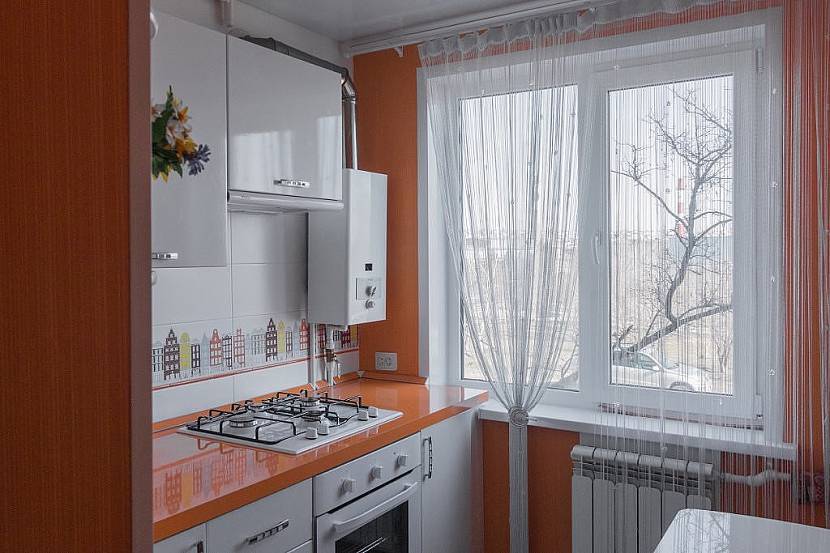 - если кухня длинная и узкая, можно повесить темные шторы, этот прием зрительно приблизит дальнюю стену;