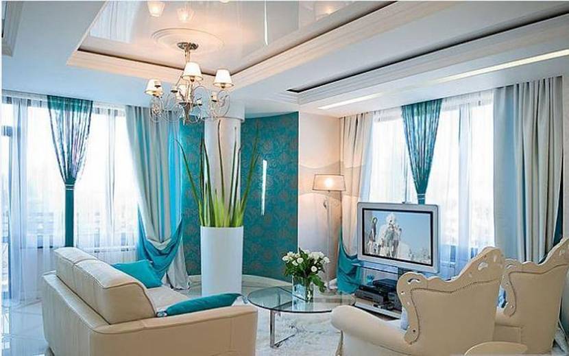 Бирюзовые оттенки подойдут для спальных помещений. Более сочные оттенки уместны в гостиных комнатах.