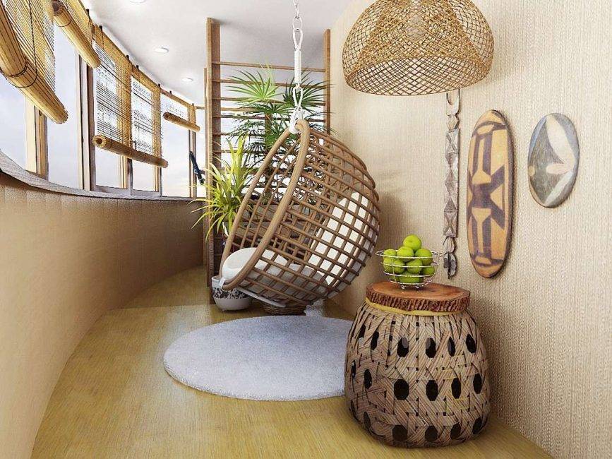 необходимо выбирать мебель в том же стиле (плетеные кресла, стеклянные столики);