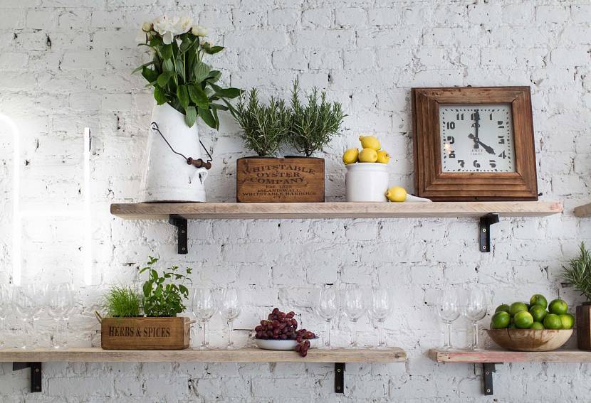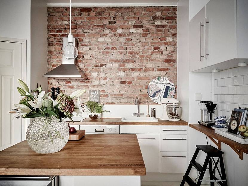 Существует масса различных вариаций декоративного оформления кухонных стен. Кирпичная стена больше соответствуют стилю лофт. Приемлема и в других направлениях интерьера. Ее могут выполнять из настоящего материала или делать имитацию. В любом случае такая поверхность поддается различному декорированию картинами, фото или часами. Не нужно бояться делать такую перегородку функциональной: она отлично подходит для размещения вытяжки.