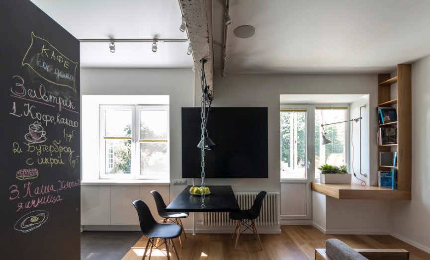 А вот стена в обеденной зоне — это чистый холст. И здесь масса вариантов для украшения, зонирования и декорирования.