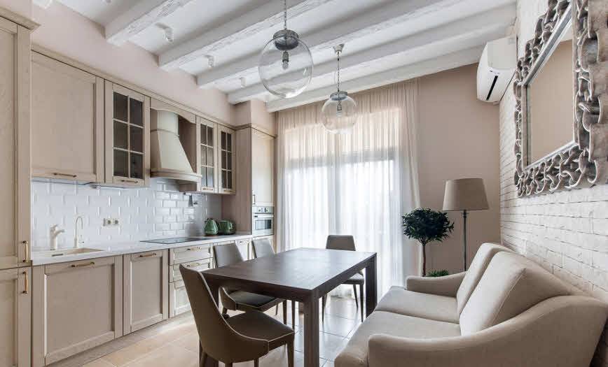 Обратите внимание на фальш-балки. Такой вариант подходит для высокой кухни и столовой, по стилю он ближе всего к провансу
