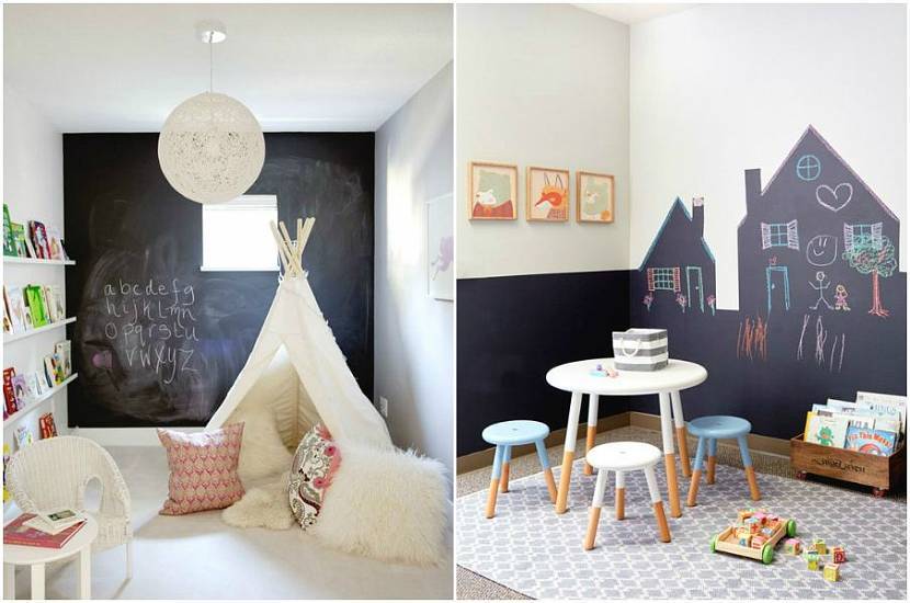 Еще один вариант – покрасить часть стены под грифельную доску. Обычно дети с удовольствием рисуют мелками. Когда чадо пойдет в школу, уголок для творчества станет частью рабочей зоны. Здесь можно будет не только рисовать, но и привыкать писать на доске, и также использовать стену как черновик при решении задач.