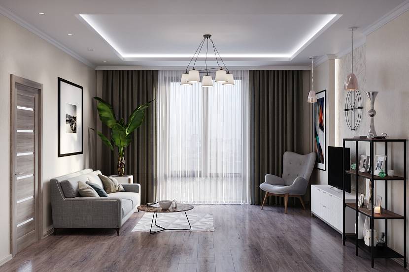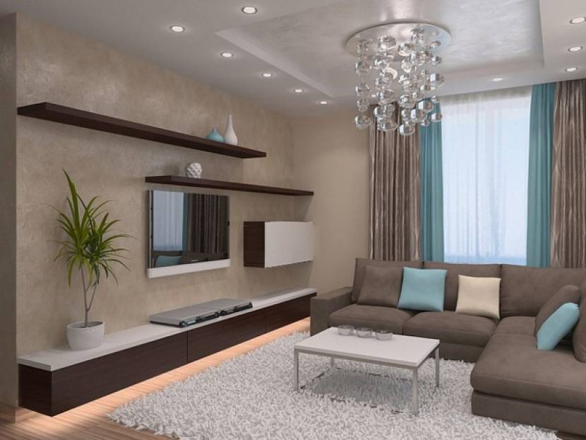 Квадратный зал небольшого размера стоит заполнять мебелью светлых тонов, оформляя таким же образом и стены. Наличие всевозможных ниш в зале можно заполнить удобными светильниками с уютными креслами, создавая здесь зону отдыха. Также они отлично подходят для расстановки цветочных горшков и расположения полок с книгами.