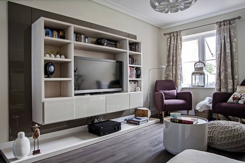 Телевизор можно повесить на стену, установив под ним деревянный комод светлых тонов с высокими ножками. По обе стороны от него можно поставить невысокие тумбы, имеющие по одному ящику. Центральную часть зала должен занять установленный на ковре журнальный столик.
