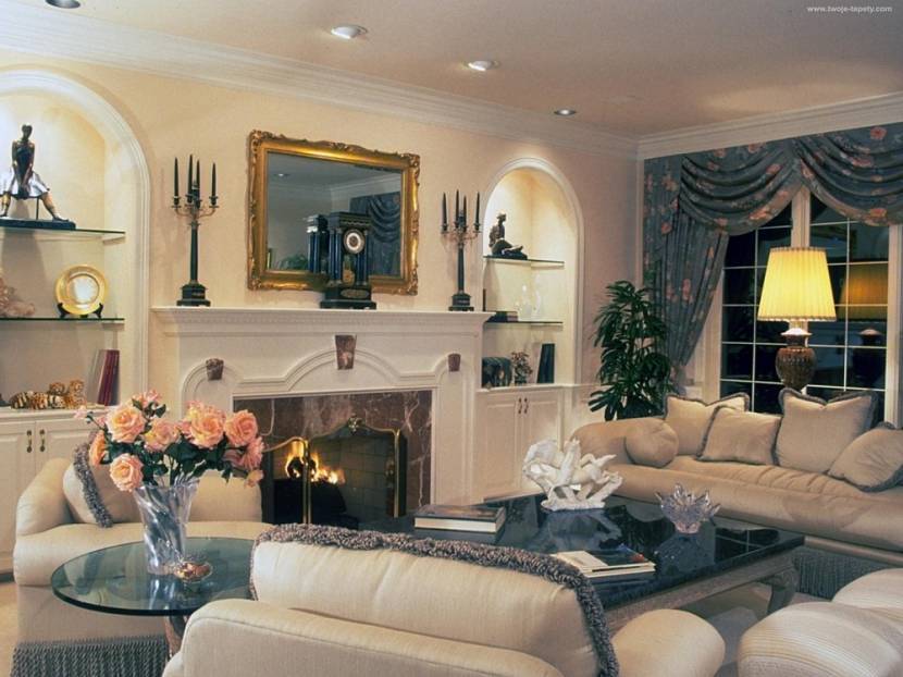 Выделение композиционного центра комнаты можно сделать освещением либо расположением на полу большого ковра либо камина. Неподалеку можно установить необычной формы столик, имеющий ажурную столешницу и витые ножки.