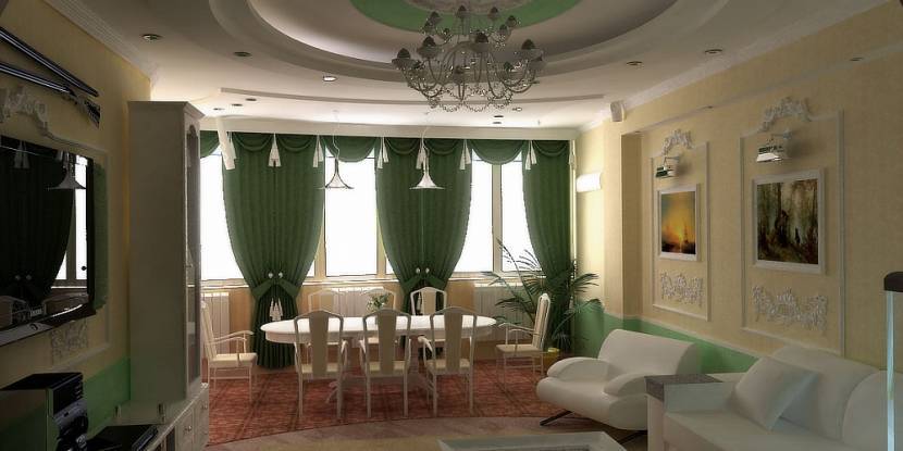 Для оформления потолка можно использовать натяжное полотно либо гипскартон с белоснежными потолочными плинтусами. Меблировать такую гостиную следует парой кресел и мягким диваном. Основная линия декора должна проявляться и в дизайне обивки мебели.