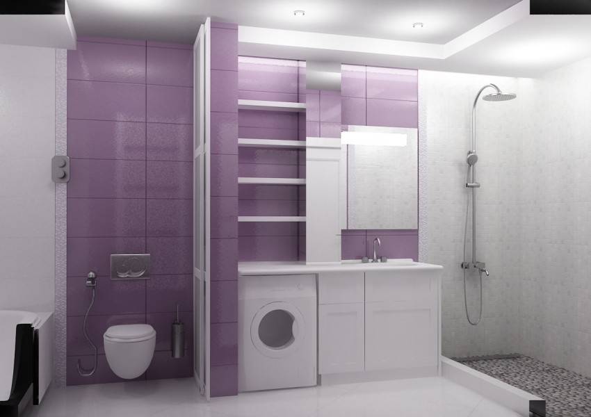 В маленькой ванной стиральную машину можно разместить между стеной и душем