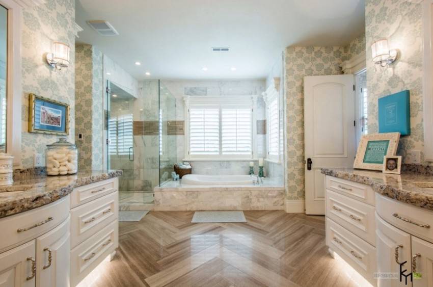 Люди, любящие роскошь должны обратить свое внимание на ванную классического стиля с дорогой плиткой и использованием натурального камня. Сантехника должная быть белоснежной, а вот сам дизайн комнаты просто обязан содержать золотистые орнаменты и бронзовые смесители