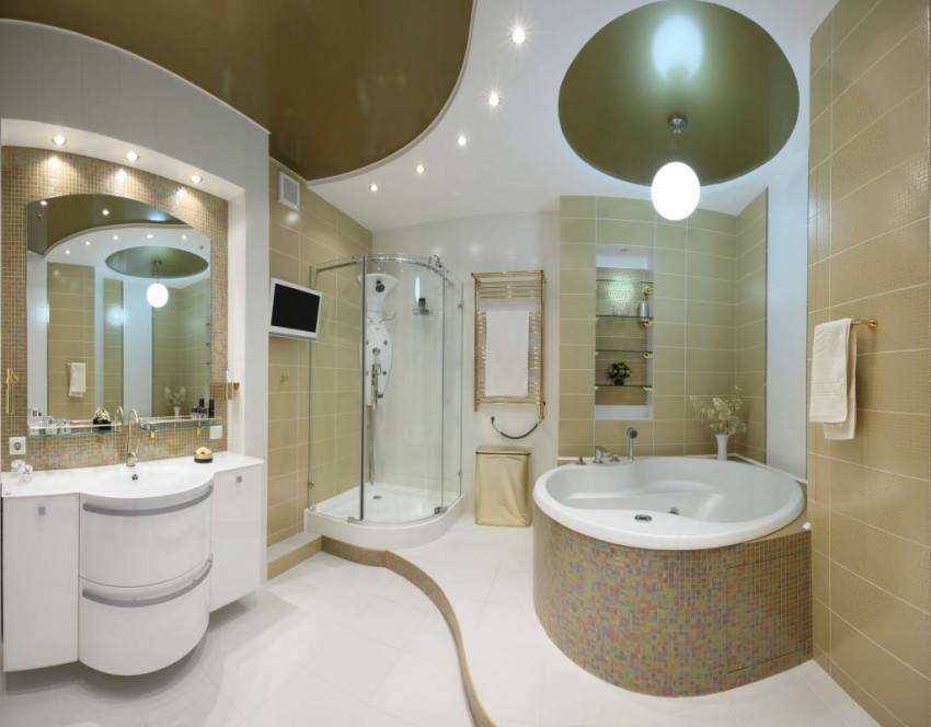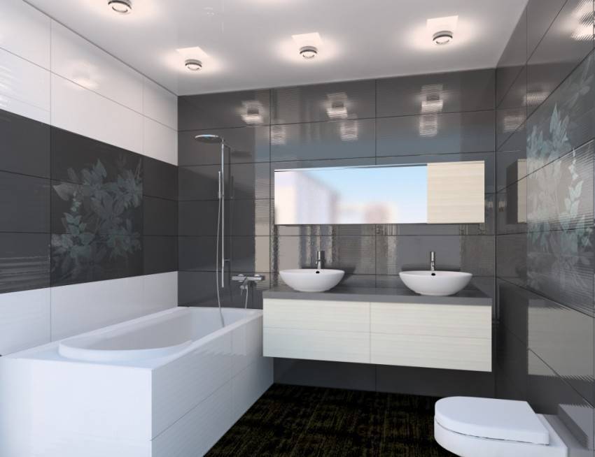 Посредством данного приёма удаётся акцентировать внимание на зеркале, ванне, либо раковине.