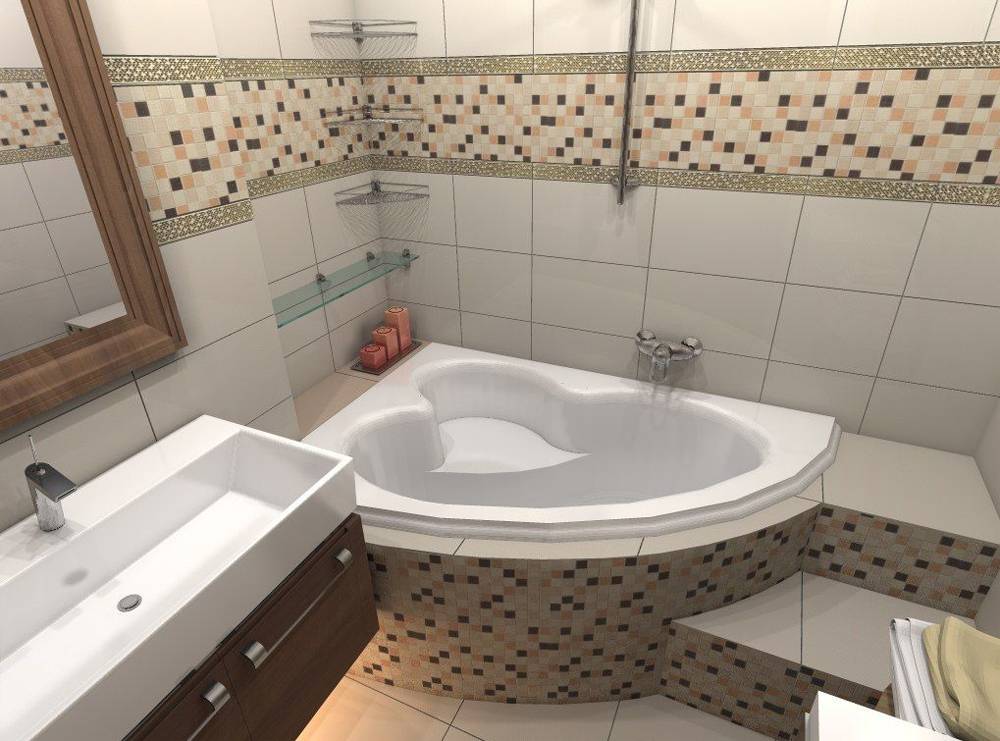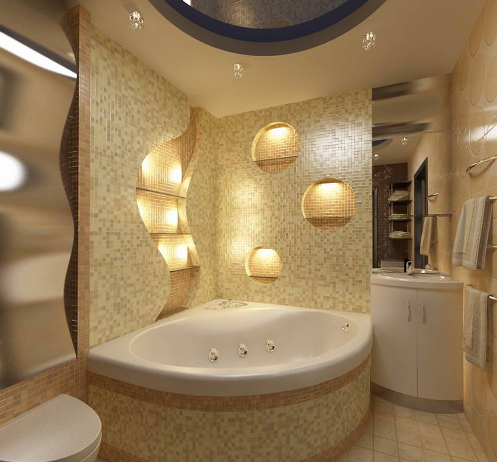 Стиль барокко можно выгодно подчеркнуть декором-лепниной. А вот унитаз, ванну и раковину можно выбрать в кремовых оттенках. Душевая кабина в такой стиль не впишется. - Не менее популярен дизайн ванной комнаты в синих токах. Проект морской тематики всегда актуален. Крупная кафельная плитка синих цветов хорошо сочетается с бежевой мозаикой. Можно и наоборот разбавить светлый кафель синими оттенками. Такое решение заметно углубит пространство маленького помещения.