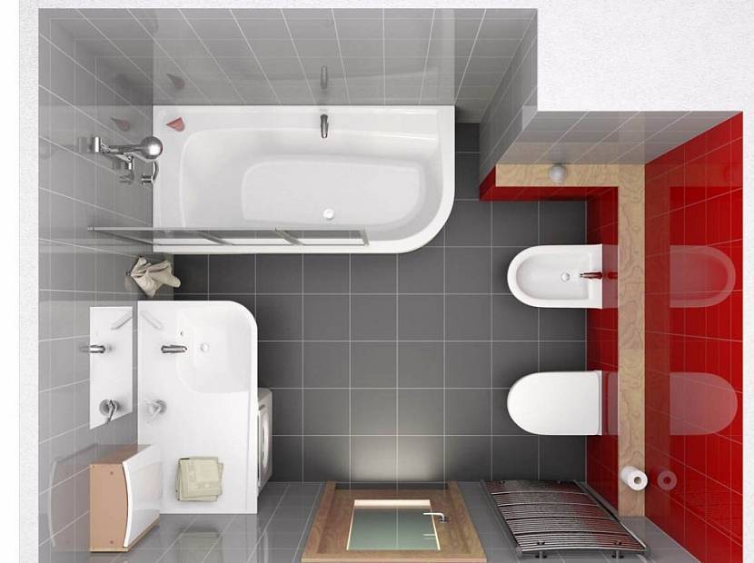2 | Угловое | В угол устанавливается душевая кабина или небольшая ванна. А напротив входа вполне свободно можно разместить унитаз и раковину. При таком варианте расположения мебели останется место для миниатюрного шкафа или компактной стиральной машины. |