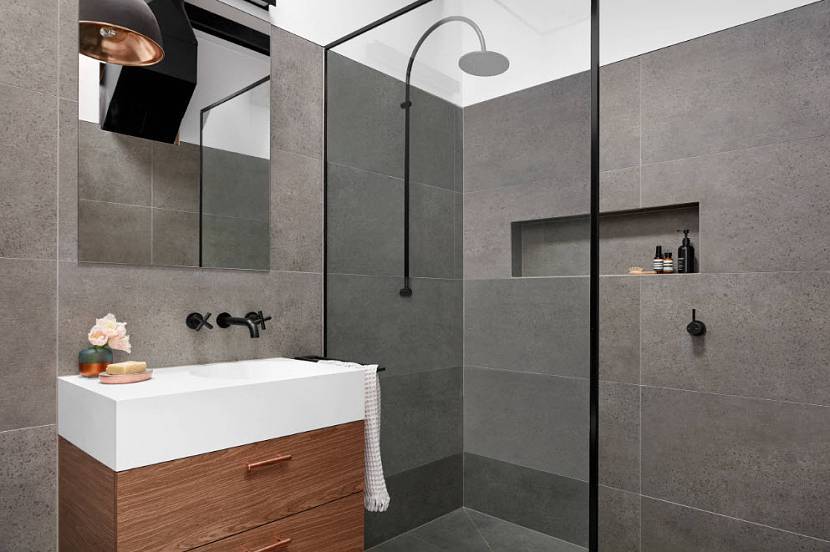 Но не нужно забывать, что светлые акценты должны иметься в интерьере. Свет при этом выбирается теплый и мягкий. Стиральную машину и душевую в таком проекте лучше подобрать в темных цветах.