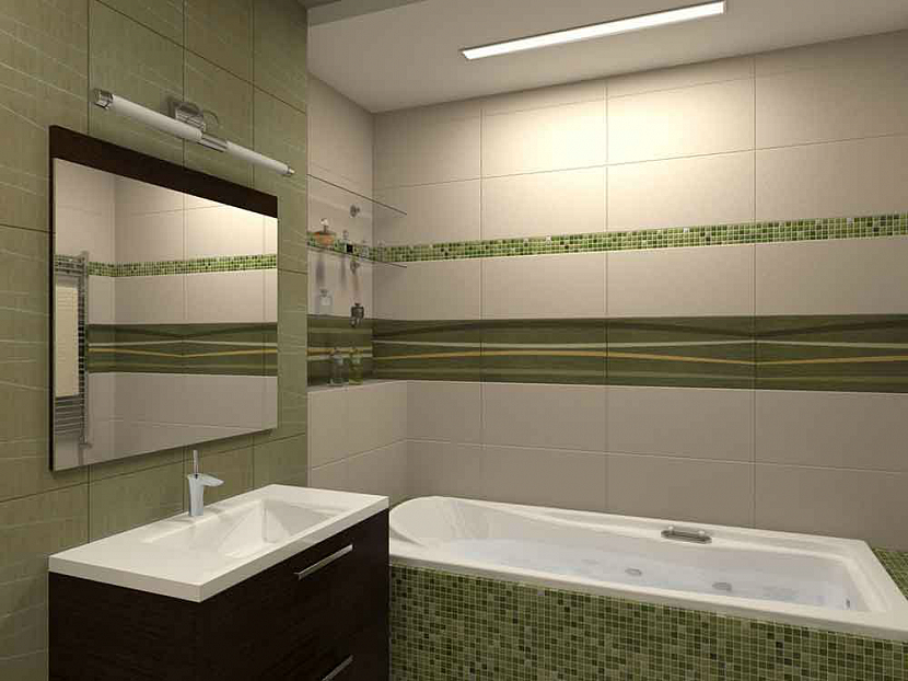 Чтобы ванная при этом не выглядела слишком уж стерильной, светлый цвет разбавляют яркими элементами. Вариантов несколько — бордюр из более темной плитки, темная нижняя часть стены (примерно — нижняя треть). Если нижняя част стены темная, пол делают того же цвета или очень близкого, если не удается найти плитку того же тона.