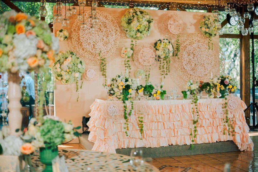 Небольшой полет фантазии, комбинирование разных видов декора помогут вам сделать идеальный свадебный дизайн для стола молодых.