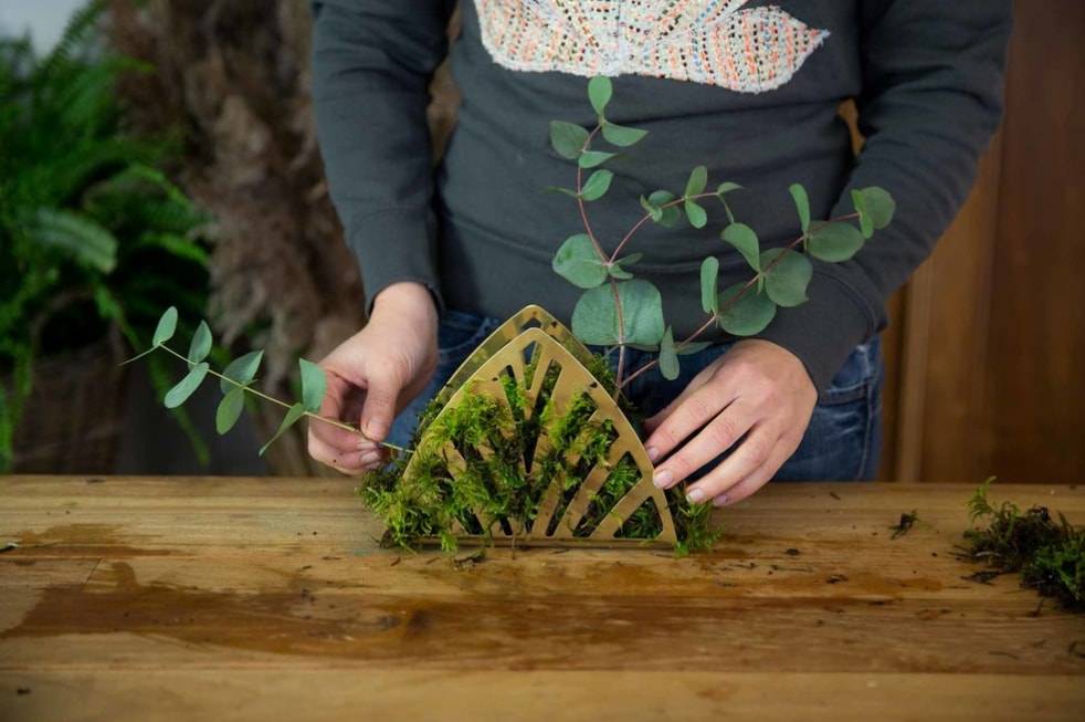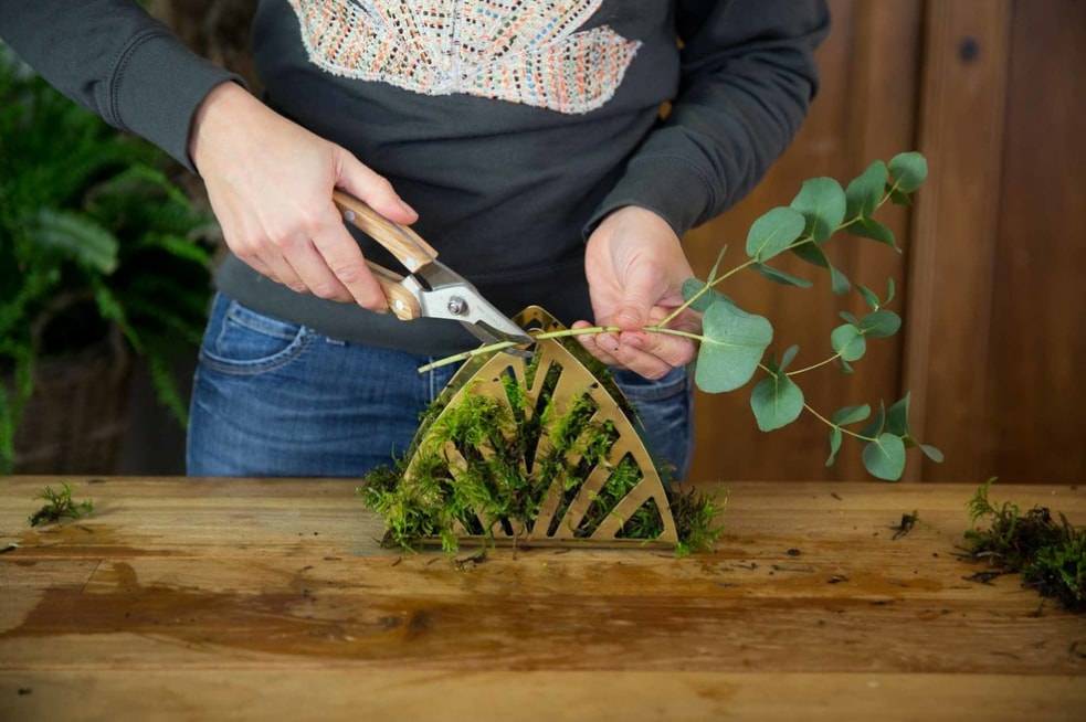 Обрезаем края веточек эвкалипта и вставляем их в губку под углом.