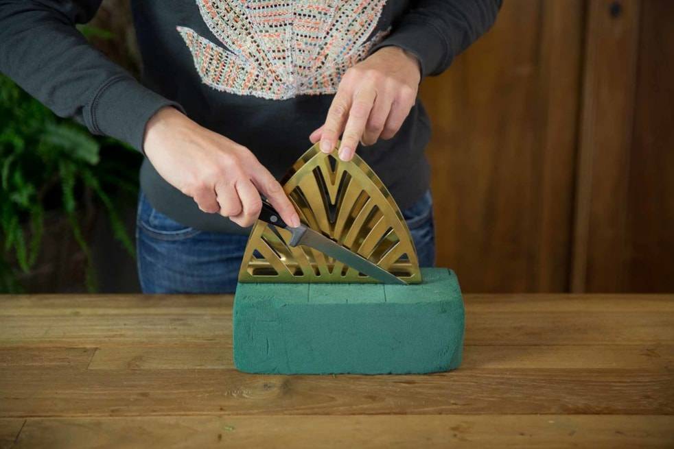 Первым делом обрезаем флористическую губку до размера салфетницы. Учитывайте, что она должна с легкостью вставляться, без дополнительных усилий.