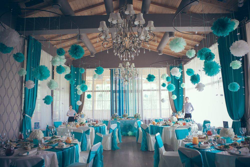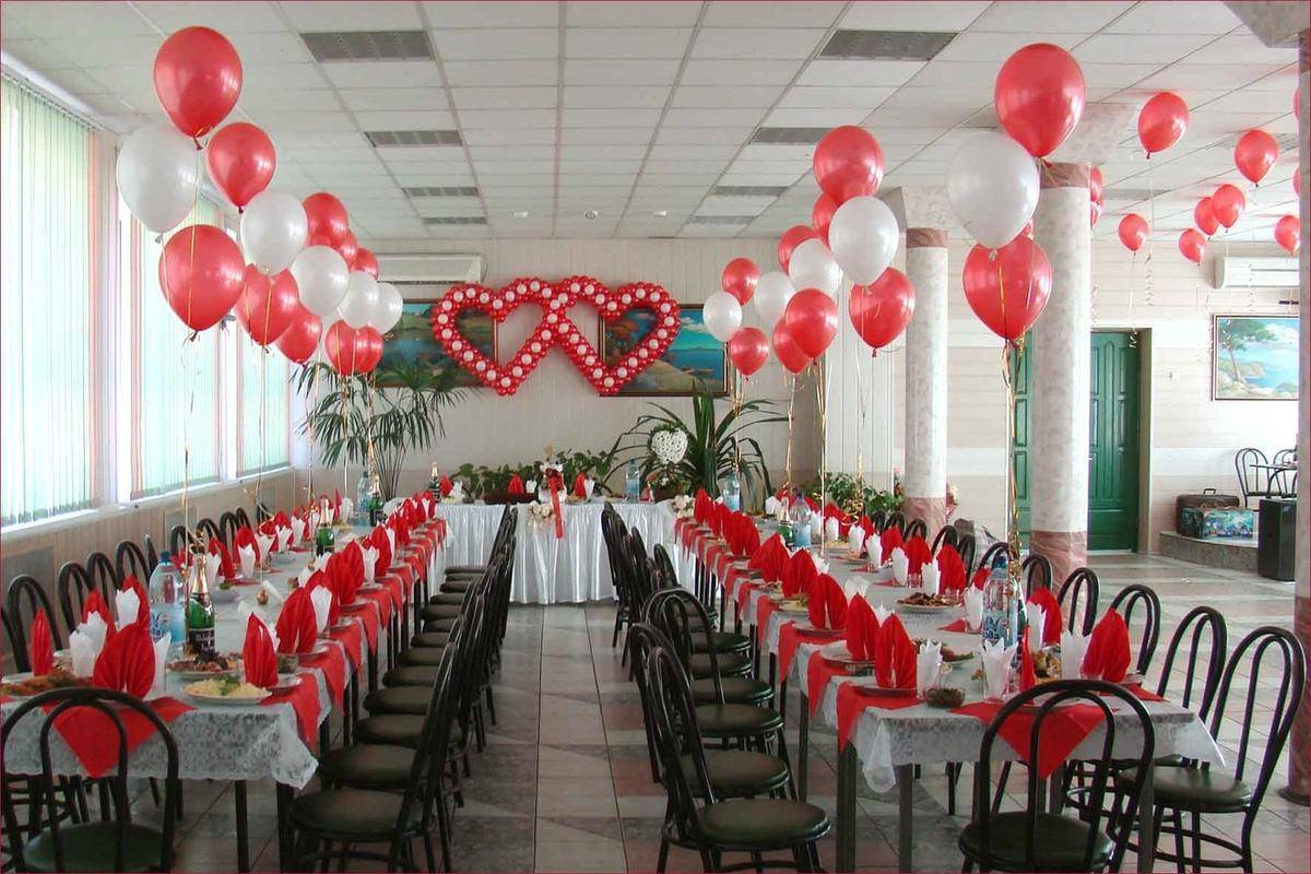 Поэтому зал должен создавать впечатление особенного места, которое навсегда запомнится каждому гостю. Для декора наиболее часто используется текстиль, гирлянды, множество воздушных шаров, а также красивые цветочные композиции.