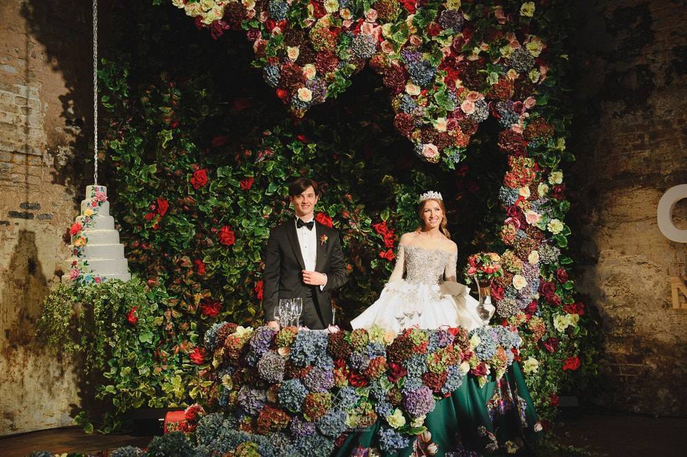 Если все свадебное торжество основано на цветочной тематике, для фона стола тоже разрешается использовать такой декоративный пейзаж или гирлянду. Даже при хорошем естественном оформлении зала, оригинальный фон для молодоженов необходим, и цветы будут хорошо сюда вписываться. Композиции можете использовать как в живом варианте, так и в искусственном (пластиковом, бумажном, тканевом). Дополните их светодиодной подсветкой, которая придаст нежность, лоск, богатство всему образу.