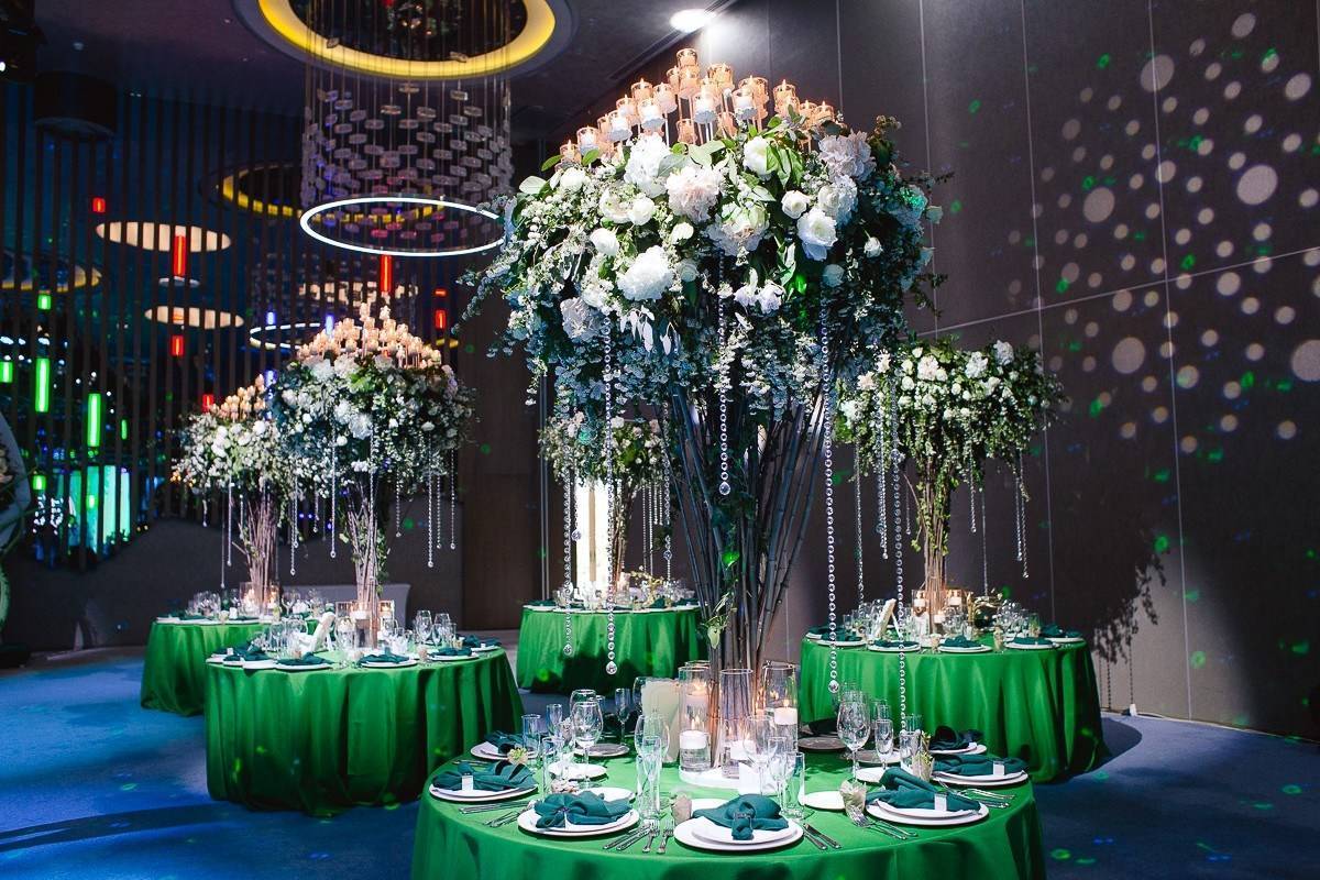 Без живых цветов торжество редко обходится, а такого масштаба тем более. Дизайнеры советуют букеты живых цветов устанавливать через 1,5 — 2,0 м стола.
