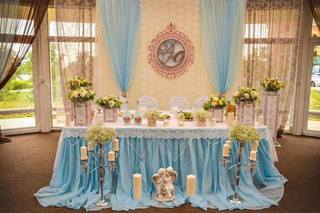 Идеи для украшения свадебного стола должны тесно переплетаться с душевным состоянием молодоженов. Старайтесь не копировать оформление чужих свадеб. Приветствуется идея нежности, скромности, для нее используют пастельные тона – белый, персиковый, голубой, нежно-розовый. Основа украшений – цветочные композиции в сочетании со свечами, зеленью, дополнительно применяют подсветку стола. Такой классический образ олицетворяет начало новой жизни, виток с чистого листа. Можете реализовать более смелые варианты с шарами или элементами мебели, но они подойдут необычным парам.