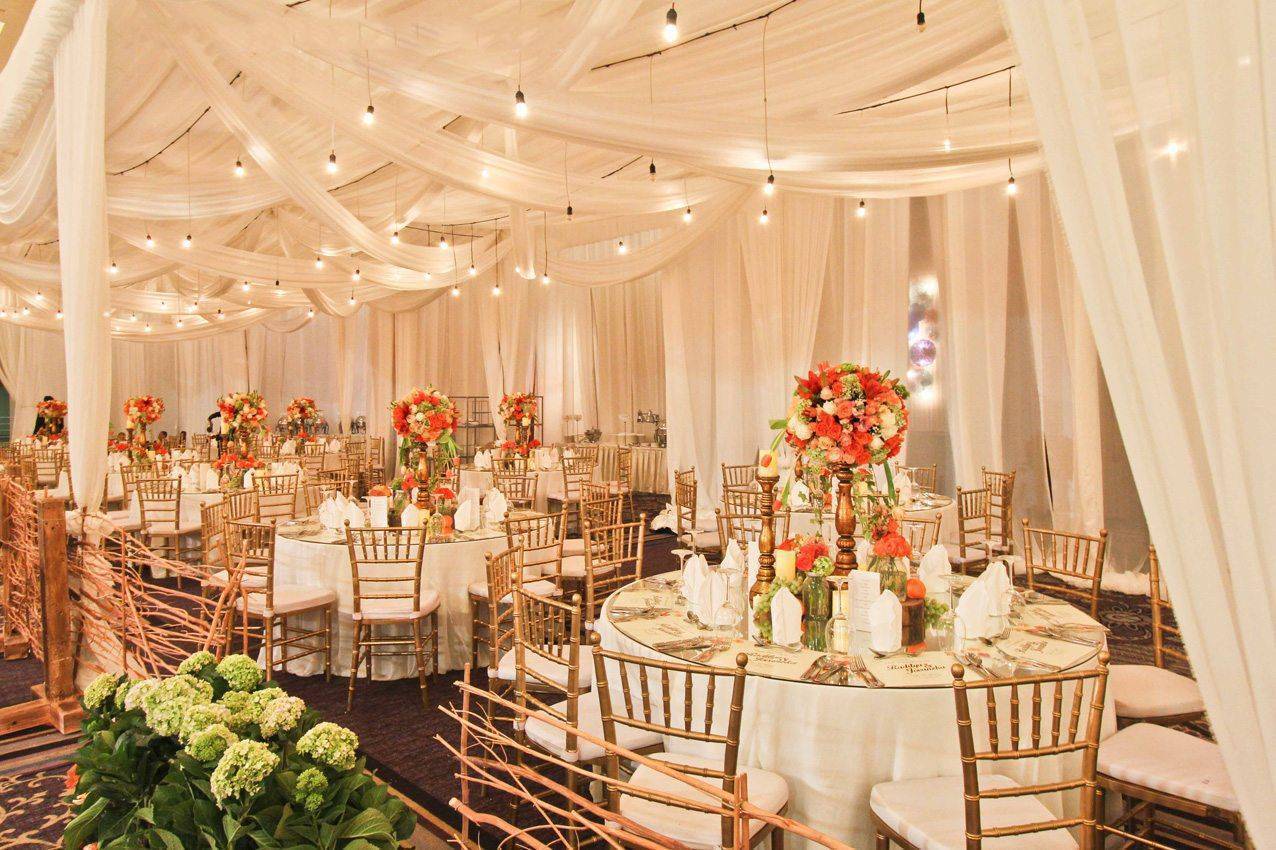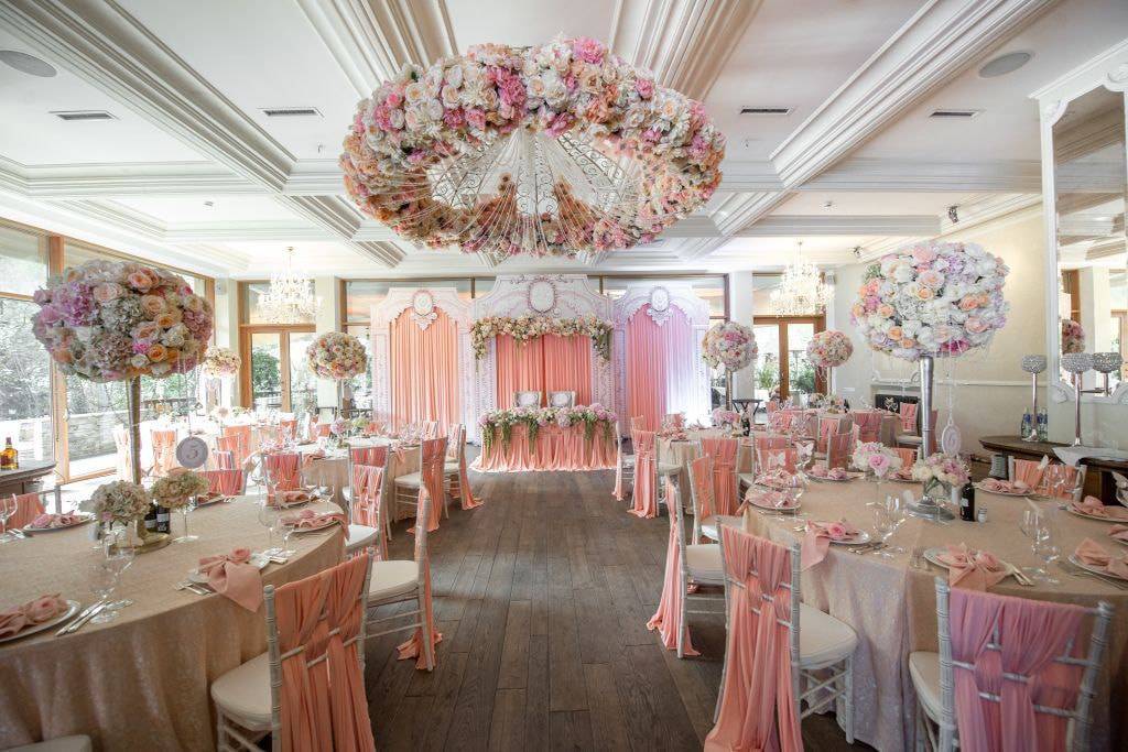 Работы по оформлению начните с составления общей концепции оформления помещения и определения, какой декор свадебного зала будет использован.