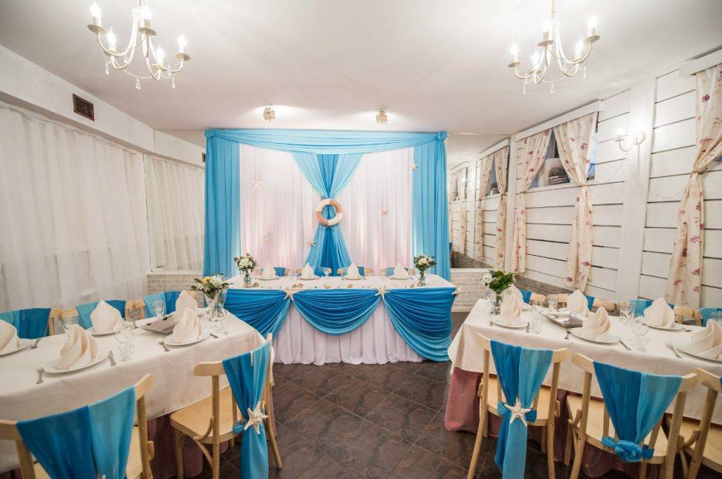 Для того чтобы оформить зал в морском стиле, особо не стоит фантазировать. Всем известное бело-голубое сочетание в декоре помещения, особенно если это будет известная полосатая ткань, прекрасно решит все вопросы. Оформление зала на свадьбу выполняют в ярких цветах, что отлично сочетается с блюдами из морепродуктов.