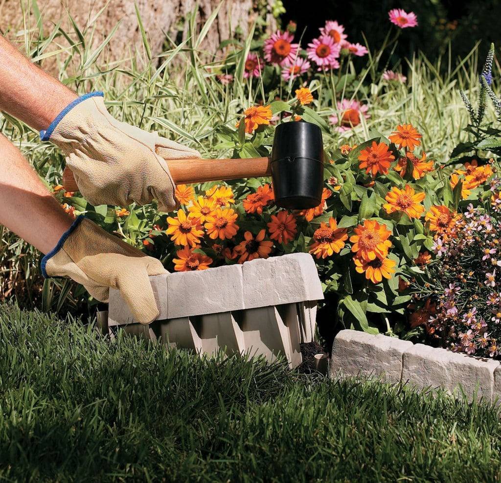 Этот метод является наиболее практичным и не затратным по времени. Можно выбрать любой вариант плиточного ограничителя, представленного на рынке, после чего сделать траншею по тому же принципу, что и под бетонные бордюры. Чтобы составляющие ограждения держались надежно и устойчиво, устанавливать нужно плотно, слегка прибивая молотком.